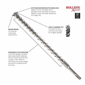 BOSCH HC2147 7/20.3 cm x 40.6 cm x 45.7 cm Bulldog SDS-Plus Broca de martelo rotativo - Processo de brasagem e endurecimento otimizado para longa vida útil - 15% mais rápido (em comparação com S4L) - Bosch A ponta de carboneto feita é mais resistente e durável sob cargas pesadas - O processo de endurecimento Bosch exclusivo resulta em mais furos por bit - Ideal para aplicações de ancoragem e furos de passagem em concreto