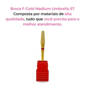 Características Principais: - Modelo:Broca F-Gold Umbrella Medium ST - Corte fino; - Remove por camadas; - Ideal para todas as etapas do alongamento; - Indicada para todas as técnicas.