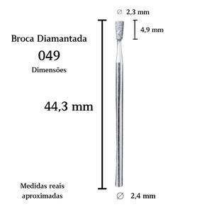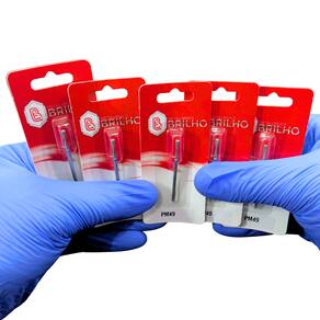O kit contém 5 brocas diamantadas modelo 049 Brilho, com formato cônico invertido estreito, indicadas para acabamento e nivelamento controlado em áreas menores. O perfil mais alongado e afilado da ponta permite maior precisão e controle durante ajustes localizados, sem ampliar a área de contato.