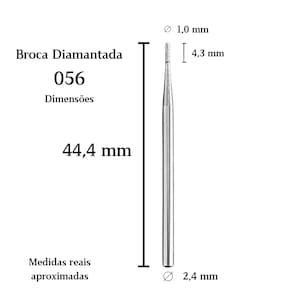 Kit com 5 Brocas Diamantadas 056 Brilho – Formato Cilíndrico com Topo Plano O kit contém 5 brocas diamantadas PM 056 Brilho, com formato cilíndrico e topo plano. Indicadas para ajustes e nivelamentos em áreas pequenas, garantem acabamento preciso e controle durante o uso. Dimensões aproximadas: comprimento total de 44,4 mm, ponta diamantada de 4,3 mm, diâmetro da ponta de 1,0 mm e haste padrão universal de 2,4 mm. Produzidas em aço inoxidável com revestimento diamantado, possuem abrasividade média (tarja azul), excelente durabilidade e compatibilidade com autoclave, estufa ou higienização química. Indicação de uso: acabamento e polimento técnico em superfícies pequenas e de difícil acesso.