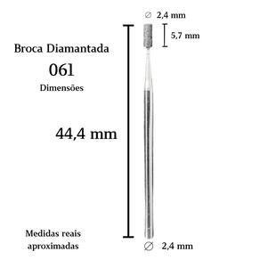 Dimensões aproximadas: comprimento total de 44,4 mm, haste padrão universal de 2,4 mm e ponta cilíndrica diamantada de 2,4 mm de diâmetro por 5,7 mm de altura.