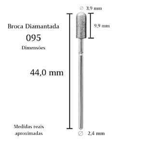 Dimensões aproximadas: comprimento total de 44,0 mm, ponta diamantada cilíndrica com 9,9 mm de altura por 3,9 mm de diâmetro e haste padrão universal de 2,4 mm.