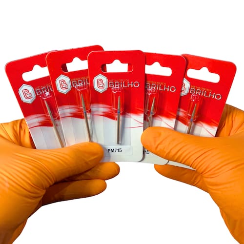 O kit contém 5 brocas diamantadas modelo PM 715 Brilho, no formato cônico de ponta fina. Desenvolvidas para trabalhos de alta precisão, são indicadas para acesso a áreas estreitas da lâmina ungueal, refinamento próximo à cutícula e acabamentos em alongamentos.