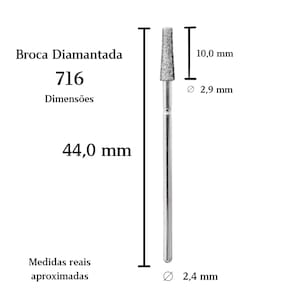 Dimensões aproximadas: comprimento total de 44,0 mm, ponta diamantada com 10,0 mm de altura, diâmetro máximo de 2,9 mm e haste padrão universal de 2,4 mm.