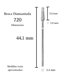 Dimensões aproximadas: comprimento total de 44,1 mm, ponta diamantada com 10,1 mm de altura, diâmetro da base de 2,8 mm e haste padrão universal de 2,4 mm.