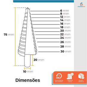 A broca escalonada de 6-30mm da Starfer é uma ferramenta de corte projetada para perfurar metais, madeira e outros materiais duros. Ela possui um formato cônico, com múltiplas etapas de diâmetros crescentes ao longo do corpo da broca.