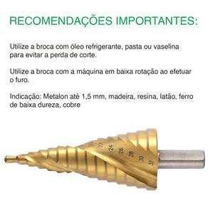 Adquira agora mesmo a Broca Escalonada Espiral Profissional Lorben e descubra a diferença que uma ferramenta de qualidade pode fazer em seus projetos. Marca: LorbenMaterial: Aço rápidoRevestimento: TitânioTipo de broca: EscalonadaQuantidade de brocas: 1 unidadeDiâmetro dos furos: 4 mm, 6 mm, 8 mm, 10 mm, 12 mm, 14 mm, 16 mm, 18 mm, 20 mm, 22 mm, 24 mm, 26 mm, 28 mm, 30 mm, 32 mmPasso 2 mmNúmero de etapas: 15Ângulo da borda externa: 118°Aplicação: Materiais de baixa dureza (Aço carbono, aço inoxidável, alumínio, cobre, latão, bronze, metalon até 1,5mm, madeira compensada, MDF, madeira aglomerada, plástico, acrílico, PVC, polipropileno, polietileno)::DICA::Utilize a broca com óleo refrigerante, pasta ou vaselina para evitar a perda de corte.Utilize a broca com a máquina em baixa rotação ao efetuar o furo.Inclui:1 Broca escalonada espiralDimensões do produto:Comprimento total: 102 mmComprimento útil: 77 mmPeso: 155 gTamanho da embalagem: 13x9x5 cmPeso da embalagem: 200 gCódigo do produto: GT6210Imagens ilustrativas. As tonalidades podem variar. Os produtos são medidos manualmente, podendo haver pequenas variações nas medidas.