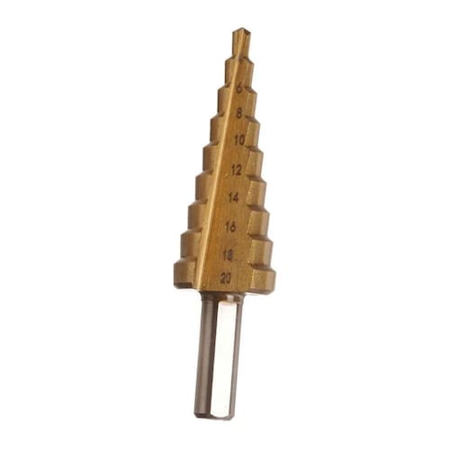Descricao A Broca Escalonada da Corneta permite um inicio de furacao rapida, possibilitando uma furacao em varias medidas com uma precisao elevada e um controle maior da furacao com qualidade e resistencia seja para uso ou domestico!- Caracteristicas do produto: Brocas em aco rapido HSS com tratamento termico e revestimento de titanio. Ideal para furos precisos e rapidos, para materiais como latao, madeira, chapas de baixo teor e plasticos.- Indicacao: Para furo em materiais como latao, madeira, chapas de baixo teor e plasticos. Para uso em parafusadeira e furadeira.- Instrucoes de uso: A broca deve ser refrigerada com oleo ou pasta durante o furo, nao deve ser usada a seco para nao danificara ponta de corte.- Tabela de velocidade: Broca escalonada 4-20mm Max. Rpm 800 - 250- Atencao: nao exceda a velocidade de perfuracao recomendada.- Cuidados: Para reduzir o risco de lesoes, sempre use adequadamente equipamento de protecao individual (oculos de protecao, botas, luvas, etc...) Manter fora do alcance das criancas.*Imagens meramente ilustrativas.Especificacao Tecnica - Dimensoes da Peca: 7,3 x 2 x 2cm- Dimensoes da Embalagem: 8,5 x 2 x 17,5cm- Quantidade Inner: 20 Pecas- Dimensoes Inner: x x cm- Quantidade Master: 200 Pecas- Dimensoes Master: 52 x 25 x 43cm- Material: Aco Rapido- Cor: Dourada- Tipo de Embalagem: Blister- Marca: Berg Ferramentas- Contem: 1 unidade- Tamanhos em diametro: 4, 6, 8, 10, 12, 14, 16, 18 e 20mm