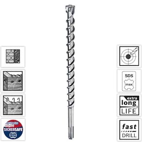 Para Uso em Martelo Rotativos e Martelos Perfuradores com Encaixe SDS Max de Todas as Marcas. Indicada para Perfurar / Instalar: Alvenaria, Tijolo, Concreto, Concreto Armado, Pedra Natural. Extremamente Resistente a Tensões e ao Calor Graças à Fusão Entre o Corpo em Aço com a Ponta Maciça de Metal Duro. Ponta Centradora com Ângulo de 90 Proporciona uma Perfuração Estável Desde o Início.