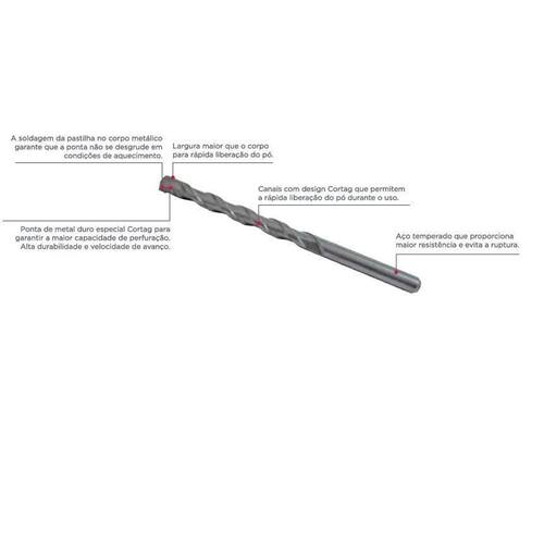 A ponta de metal duro especial Cortag garante a maior capacidade de perfuração, enquanto a largura maior que o corpo permite uma rápida liberação de pó durante o uso. Os canais com design Cortag também contribuem para a rápida liberação do pó, mantendo a eficiência e qualidade do trabalho.