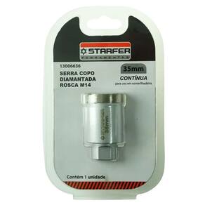 Especificações Técnicas: Tipo: Serra copo contínua diamantada Diâmetro: 30 mm Material do corpo: Aço carbono Tipo de lâmina: Contínua diamantada Rosca: M14 Compatibilidade: Esmerilhadeira (ou furadeira com adaptador Starfer) Embalagem: Blister duplo Marca: Starfer Ref.: 13006628