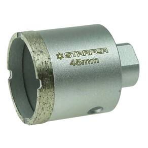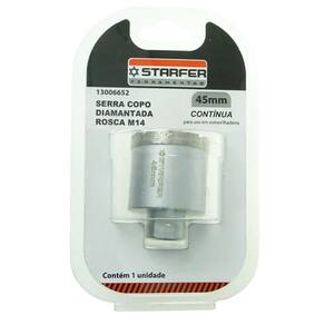 Especificações Técnicas: Tipo: Serra copo contínua diamantada Diâmetro: 45 mm Material do corpo: Aço carbono Tipo de lâmina: Contínua diamantada Rosca: M14 Compatibilidade: Esmerilhadeira (ou furadeira com adaptador Starfer) Embalagem: Blister duplo Marca: Starfer Ref.: 13006652