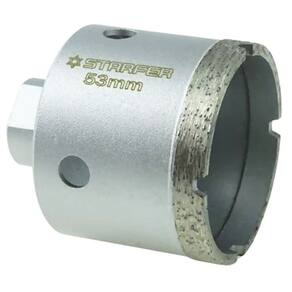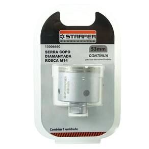 Especificações Técnicas: Tipo: Serra copo contínua diamantada Diâmetro: 53 mm Material do corpo: Aço carbono Tipo de lâmina: Contínua diamantada Rosca: M14 Compatibilidade: Esmerilhadeira (ou furadeira com adaptador Starfer) Embalagem: Blister duplo Marca: Starfer Ref.: 13006660