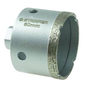 Especificações Técnicas: Tipo: Serra copo contínua diamantada Diâmetro: 60 mm Material do corpo: Aço carbono Tipo de lâmina: Contínua diamantada Rosca: M14 Compatibilidade: Esmerilhadeira (ou furadeira com adaptador Starfer) Embalagem: Blister duplo Marca: Starfer Ref.: 13006679