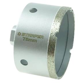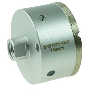 Especificações Técnicas: Tipo: Serra copo contínua diamantada Diâmetro: 75 mm Material do corpo: Aço carbono Tipo de lâmina: Contínua diamantada Rosca: M14 Compatibilidade: Esmerilhadeira (ou furadeira com adaptador Starfer) Embalagem: Blister duplo Marca: Starfer Ref.: 13006709