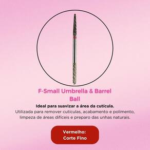 A broca F-Small Umbrella & Barrel Ball é uma broca com ponta dupla, o formato umbrella é ideal para trabalhar na remoção de cutículas mortas ou resíduos acumulados sem causar lesões. Já o formato barrel ball, com sua ponta arredondada, é perfeito para nivelar a superfície de unhas artificiais, removendo ondulações e garantindo um acabamento liso. f-small indica que a broca é de tamanho pequeno, sendo ideal para trabalhos precisos e delicados, e permitindo alcançar áreas de difícil acesso como os cantos e base da unha próxima à cutícula. Seu material é de alta qualidade e garante durabilidade e resistência ao desgaste. Indicada para limpeza da área da cutícula, remoção de resíduos de produtos como gel, acrílico ou esmaltes em gel, e dar acabamento nas laterais e na superfície das unhas. Ela oferece equilíbrio entre abrasão e suavidade, sendo ideal para profissionais que buscam precisão, eficiência e conforto em seus procedimentos.