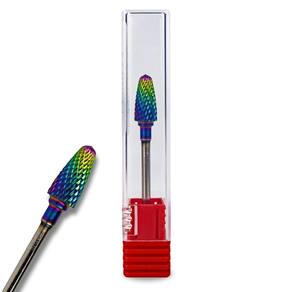Broca de corte fino F com uma ponta em formato de bala e acabamento colorido. Permite um trabalho detalhado e preciso, especialmente em áreas menores e de difícil acesso, como as dobras laterais das unhas.