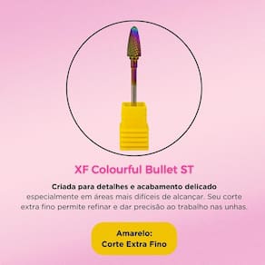 Características Principais: - Modelo: XF Colourful Bullet ST; - Ideal para acabamentos; - Corte Extra fino; - Material de alta resistência; - Indispensável para manciures.