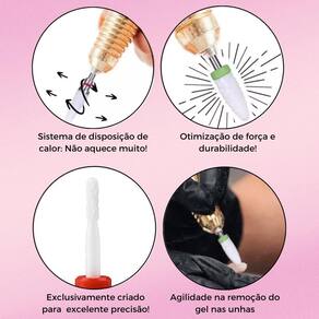Características principais: - Cerâmica: oferece maior durabilidade, resistência ao calor e menor risco de aquecimento excessivo da área trabalhada; - Ideal para pequenos detalhes; - Indicada para todas as técnicas de alongamentos e acabamentos com brocas; - Acompanha caixinha para armazenamento; - Indispensável para profissionais; - Entrega acabamento impecável e delicado