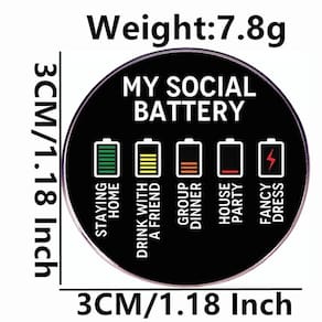 Material: Liga Tamanho: 3x3 cm Peso: 7,8 g Quantidade: você obterá todas as peças em quantidade igual à primeira foto principal ShowCreative Design: apresenta uma superfície redonda de esmalte preto com ícones coloridos de bateria e a frase “Minha bateria social”, representando humoristicamente diferentes situações sociais. Construção em liga durável: feito de liga de alta qualidade com revestimento de esmalte, este broche é leve, robusto e resistente ao desbotamento para uso duradouro. Compacto e leve: com um tamanho de 3x3 cm e peso de 7,8 g, este broche é confortável de usar diariamente e fácil de colocar em roupas ou acessórios. Acessório versátil: funciona como alfinete de blusa, alfinete de lapela ou crachá para jaquetas, mochilas e chapéus, tornando-o adequado para uso casual, roupas temáticas ou coleções de novidades. Estilo de humor unissex: projetado para homens e mulheres, este alfinete de blusa adiciona personalidade e humor, ideal para estudantes, introvertidos ou qualquer pessoa com um senso de moda divertido.