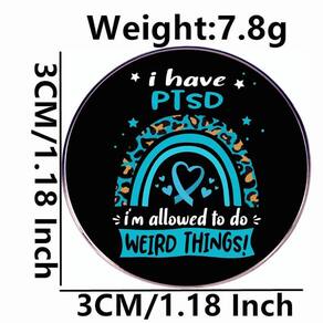 Material: liga Tamanho: 3 x 3 cm Peso: 7,8 g Quantidade: você obterá todas as peças em quantidade igual à primeira foto principal. Mostre um design exclusivo de conscientização: apresenta uma fita azul com padrão de estampa de arco-íris e leopardo, simbolizando a consciência do PTSD com humor e individualidade. Citação fortalecedora: impressa com a frase “Tenho PTSD, tenho permissão para fazer coisas estranhas”, criando um emblema alegre, mas significativo. Material de liga durável: feito de liga de alta qualidade, resistente ao desbotamento e arranhões, garantindo um uso duradouro. Compacto e leve: tamanho 3 x 3 cm, peso 7,8 g, fácil de colocar em blusas, jaquetas ou bolsas como um elegante alfinete de lapela ou alfinetes de blusa. Acessório Statement: Um broche de metal criativo e ousado que promove a consciência e a autoexpressão, adequado para uso diário ou eventos de conscientização.