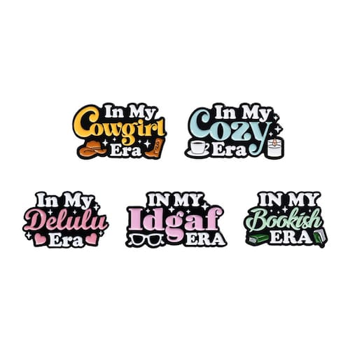 Material: Liga Tamanho: 3x1,8 cm Peso: 26 g Quantidade: você receberá todas as peças em quantidade igual à primeira foto principal MostrarConjunto de 5 broches modernos: apresenta cinco alfinetes exclusivos com frases divertidas e motivacionais como “In My Cowgirl Era” e “In My Bookish Era”, refletindo diferentes estilos de vida e estados de espírito. Material de liga de alta qualidade: feitos de liga durável, esses broches são feitos para durar, mantendo suas cores vibrantes e design ao longo do tempo. Acessório versátil e divertido: perfeitos para adicionar um toque pessoal e divertido a jaquetas, blusas, bolsas e cachecóis, esses alfinetes são ideais para expressar seu estilo único. Leve e confortável: pesando apenas 26 g, esses pinos são fáceis de usar sem parecerem pesados ou desconfortáveis durante todo o dia. Ótimos para todas as ocasiões: se você está expressando seu amor por livros, café ou simplesmente abraçando sua época, esses broches são uma declaração de estilo onde quer que você vá.