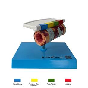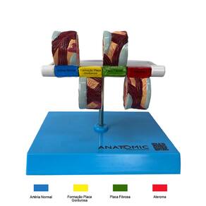 Apresenta estrutura do brônquio saudável e patológico, em corte transversal com quatro estágios de um brônquio, divididos em cores, brônquio normal (azul), hipersecreção (amarelo), inchaço (verde) e espasmo muscular (vermelho). As alterações no tecido brônquico ocorrem durante a asma e a bronquite crônica. Todos os estágios são fixos em um eixo de metal, permitindo seu movimento giratório. Montado sobre haste de metal e base.