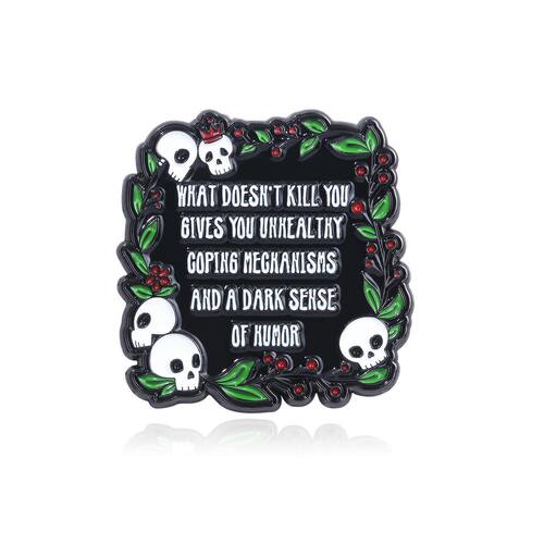 Material: Quantidade de liga: você obterá todas as peças em quantidade igual à primeira foto principal. ShowDark Humor Quote Design — Apresenta a frase em negrito “O que não mata você fornece mecanismos de enfrentamento prejudiciais à saúde e um senso de humor negro”, emoldurada com caveiras e folhas para uma aparência gótica. Construção em liga durável — Feita de liga resistente com acabamento esmaltado, garantindo detalhes vibrantes e desgaste duradouro sem desbotar. Acessório de estilo versátil — funciona como broche, alfinetes de blusa, alfinete de lapela ou crachá, perfeito para decorar jaquetas, camisas, mochilas e chapéus. Compacto e leve — Confortável de usar e fácil de transportar, o que o torna adequado para roupas diárias ou ocasiões temáticas. Perfeito para ocasiões — Ideal para Halloween, shows de punk, encontros góticos, cosplay ou como uma peça marcante para mostrar uma personalidade única.