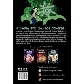 A magia tem um lado sombrio... e, junto de seus amigos, Aster precisará decidir de qual lado da magia quer ficar. Repleto de aventuras e feitiços em meio ao festival de bruxaria e metamorfose, Bruxa do Solstício de Inverno é a conclusão da trilogia de histórias em quadrinhos O Menino Bruxa. Aster sempre quis participar do Festival do Solstício de Inverno, reunião anual com competições de bruxaria e metamorfose em que toda a família Vanissen está presente. O maior desejo de Aster é poder mostrar o conhecimento que adquiriu e o talento que aperfeiçoou nos últimos tempos. Por outro lado, seu maior desafio é competir como bruxa. No entanto, ele está determinado a provar para todos que tem orgulho do que é e do que aprendeu, mesmo sabendo que não será fácil desafiar as normas tradicionais. Já Ariel, amiga de Aster, está lidando com uma situação inquietante: uma bruxa misteriosa surge em seus sonhos dizendo que sabe a verdade sobre o passado da garota. Ariel é grata por tudo o que os Vanissen fazem por ela, mas o que mais deseja é encontrar um lugar onde realmente tenha a sensação de pertencimento. O Festival do Solstício de Inverno é repleto de atividades emocionantes, mas para Aster e Ariel nada sai como planejado. Quando uma força poderosa e sombria invade a reunião e ameaça destruir tudo o que Ariel lutou para construir, será que os jovens bruxas conseguirão ter coragem para lutar juntos? Ou será que a magia das trevas vai separá-los para sempre? “Este último livro da série vai agradar fãs novos e antigos.” – Kirkus Reviews “Uma aventura no gelo de deixar o coração quentinho.” – School Library Journal “Um livro na medida... com um ritmo envolvente, personagens adoráveis, enredos cativantes e ilustrações coloridas e vivas.” – Booklist