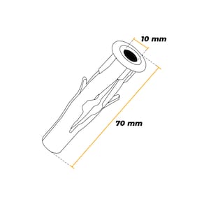 Comprimento da bucha: 70 mm Diâmetro da broca: 10 mm Diâmetro do parafuso: 5-6 mm Quantidade por embalagem: 50 peças Indicado: Parede oca ou solida Material: Poliuretano Marca: Plast