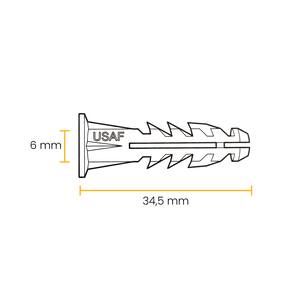 Modelo: U/B Diâmetro: 6 mm Quantidade: Pacote com 100 peças Incremento de até 30% na capacidade de fixação Borda de apoio que impede a bucha de entrar totalmente na parede Aletas fixas que evitam a rotação durante o aperto do parafuso Aletas maciças que aumentam a rigidez e resistência Material: Polietileno de Alta Densidade (PEAD) Alta resistência à compressão e tração