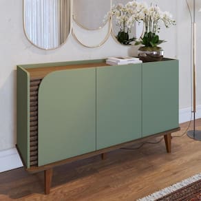 O tampo madeirado, elegantemente recuado, proporciona a sensação de uma bandeja, definindo o caráter único deste buffet. Sua base com quinas arredondadas adiciona um toque suave à estrutura. Com 03 portas de giro, o interior revela prateleiras reforçadas, perfeitas para a organização de louças.
