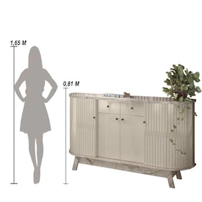 O Buffet Mônaco conta com painéis em MDP de 15 e 25mm e portas flexíveis em MDF, criando um visual elegante e durável. O tampo e a base com detalhes curvos, juntamente com as gavetas com corrediças telescópicas, oferecem praticidade e sofisticação. As portas com dobradiças metálicas, puxadores em poliestireno e pés "palito" completam o design, trazendo charme e modernidade para o seu ambiente.