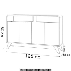 A estrutura em MDP garante resistência e estabilidade no uso diário, enquanto os cantos curvos reforçam o apelo estético do Buffet Aparador, criando uma composição moderna e agradável visualmente.