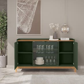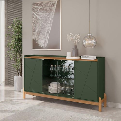 Com a mistura de elementos minimalista e retrô, o buffet Bari é um móvel cheio de personalidade e indicado para deixar sua sala de jantar ou estar, ainda mais charmosa. Possui quatro portas, sendo duas em vidro temperado de 4mm e as outras duas em MDF de 15mm ambas com prateleiras internas. Estrutura de pés de madeira maciça. É ideal para armazenar aparelhos de jantar, travessas e copos. Seu tampo também pode ser utilizado como apoio para objetos decorativos, bebidas ou até mesmo como bancada para acomodar utensílios para servir drinques e petiscos. Acabamento da Porta: Pintura UV Acabamento da Prateleira: Vidro Acabamento dos Pés: Verniz Altura dos Pés: 25 cm Ambiente Principal: Sala de Jantar Complexidade da Montagem: Baixa: pode ser montado por uma pessoa sozinha Cor: Verde Oliva / Cedro Cor do Produto: Verde Oliva / Cedro Escala de Brilho: Semi-Fosco Escala de Brilho da Porta: Semi-Fosco Escala de Brilho da Prateleira: Brilhante Informações Complementares: Portas Centrais de Vidro de 4mm temperado Itens Inclusos: 01 - Buffet Bari ; 01 - Manual de Montagem Detalhado Linha ou Coleção: Bari Manual de Montagem e Instalação: https://product-hub-prd.madeiramadeira.com.br/898804/documents/853fa2a3-61d7-4bfc-bf77-71f5074721demanualdemontagembuffetbari.pdf Material da Porta: Vidro Material da Prateleira: Vidro Material do Puxador da Porta: Metal Material dos Pés: Madeira Maciça Material Principal: MDF/MDP Necessita Montagem: Sim Origem do Produto: Nacional Pés Reguláveis: Não Peso: 46,9 kg Peso Máximo por Prateleira: 5 kg Possui Adega: Não Possui Espelho: Não Possui Nicho: 04 Possui Pés: 04 Possui Portas: 04 Possui Rodízio: Não Recomendações de Uso, Manutenção e Limpeza: Recomenda-se limpar o produto com flanela ou pano macio seco, não utilizar produtos abrasivos, desengordurantes, álcool ou solvente. Mantê-lo em lugar livre de umidade e/ou exposição direta ao sol. Sapatas Niveladoras: Não Sistema de Montagem: Parafusos, Minifix, Cavilhas e Pregos Suporta Até (kg): 65 kg Tipo de Dobradiça/Corrediça da Porta: Metálica Tipo de Madeira Maciça dos Pés: Pinus Tipo de Porta: Bater Tipo de Puxador da Porta: Externo