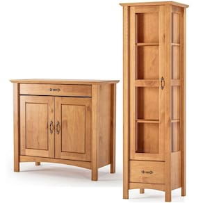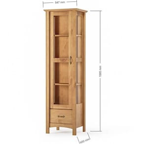 A Cristaleira é feita em Madeira de Pinus de Reflorestamento, Maciço,e acabamento em verniz fosco. A Cristaleira de Madeira conta com 1 porta de vidro com dobradiças de pressão, 1 gaveta com corrediças telescópicas e puxadores em metal na cor ouro envelhecido.