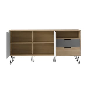 Com design elegante em linhas retas e tons neutros, o Buffet é perfeito para compor salas modernas. Conta com duas portas com dobradiças de metal, duas gavetas espaçosas e um nicho aberto, ideais para armazenar louças, talheres ou criar uma bancada para bebidas e objetos decorativos. Possui prateleira interna fixa, tampo amplo e pés metálicos que trazem estabilidade e um toque moderno. O acabamento em pintura UV texturizada e acetinada oferece beleza e fácil manutenção. Este móvel chegará em sua casa separado em 02 volumes.