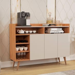 Buffet Aparador Retrô Celta é ideal para sua sala ou cantinho do café! Com design retrô ele irá agregar muito mais charme e requinte ao seu ambiente. Possui 3 portas com dobradiças metálicas, nicho e prateleiras, excelente espaço interno. Um amplo tampo para acomodar bebidas, objetos de decoração, taças etc. Elaborado com chapas em madeira MDP e pés em madeira maciça, esses atributos garantem ao produto maior resistência e durabilidade. Acabamento da Porta: Impressão Acabamento da Prateleira: Impressão Ambiente Principal: Sala de Estar Complexidade da Montagem: Baixa: pode ser montado por uma pessoa sozinha Cor: Nature/Off White Cor do Produto: Nature/Off White Escala de Brilho: Semi-Brilho Escala de Brilho da Porta: Semi-Brilho Escala de Brilho da Prateleira: Semi-Brilho Itens Inclusos: 1 Buffet, Kit Ferragens e Manual de Montagem Manual de Montagem e Instalação: https://cdn2.madeiramadeira.com.br/atributo/giga-moveis/930163-buffet-celta-giga.pdf Material da Porta: MDP Material da Prateleira: MDP Material dos Pés: Madeira Maciça Material Principal: MDP Necessita Montagem: Sim Origem do Produto: Nacional Pés Reguláveis: Não Peso: 30,45 kg Peso Máximo por Prateleira: 5 kg Possui Adega: Não Possui Bandeja: Não Possui Possui Espelho: Não Possui Nicho: 05 Possui Pés: 04 Possui Portas: 03 Possui Rodízio: Não Possui Vidro: Não Quantidade de Nichos: 05 Recomendações de Uso, Manutenção e Limpeza: Limpe com pano levemente umedecido em água. Nunca utilize produto químico. Sapatas Niveladoras: Não Sistema de Montagem: Parafusos, Cavilhas e Girofix Suporta Até (kg): 50 kg Tamanho: Tipo de Dobradiça/Corrediça da Porta: Metálica Tipo de Madeira Maciça dos Pés: Eucalipto Tipo de Porta: Bater Tipo de Puxador da Porta: Embutido Marca: Giga Móveis
