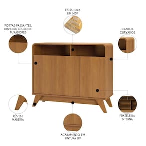 A estrutura em MDP garante resistência e estabilidade no uso diário, enquanto os cantos curvos reforçam o apelo estético do Buffet Aparador, criando uma composição moderna e agradável visualmente.