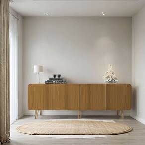 Fabricado em MDF e MDP de 15mm, o Buffet Bilbao se destaca pelo seu design contemporâneo e acabamento premium. Os puxadores de alumínio em tom dourado agregam requinte, enquanto o sistema de amortecimento nas portas proporciona um fechamento suave e silencioso.