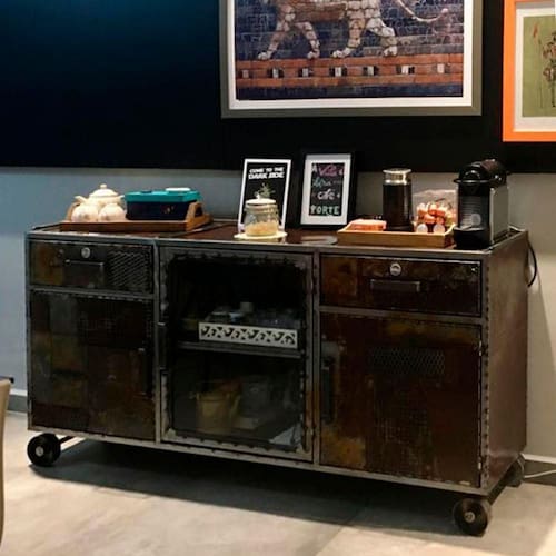Esse móvel é confeccionado a mão por uma equipe especializada em móveis em aço e madeira.