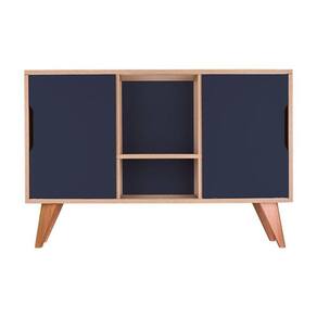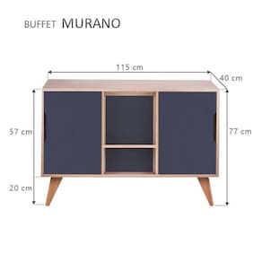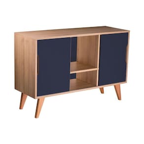 Buffet / Aparador / Balcão Modelo Murano cor Carvalho Treviso com 2 portas Azul Marinho, o móvel perfeito para deixar seu ambiente com estilo e organizado. Possui dois compartimentos internos com 2 portas laterais e uma prateleira central visível para colocar objetos de decoração. Móvel apoiado em quatro lindos pés torneados em madeira maciça. O móvel apresenta um estilo clean sem puxadores, apenas um recorte nas portas para abrir e fechar. Montagem: Vai desmontado. Cor do Móvel: Madeira Clara (Carvalho Treviso) e portas Azul Marinho. Cor dos pés: Amadeirado de cor clara. Medidas: Largura Total 115cm x Altura Total 77cm x Profundidade Total 40cm, portas A 53cm x L 37cm, pés A 20cm. Material: MDP com espessura 1,5cm Limpeza: Recomenda-se a limpeza com pano seco ou levemente umedecido. Importante: Este anúncio inclui somente o produto conforme descrição acima. Todos os elementos de decoração das fotos não acompanham o mesmo. Ean: 7897116777185