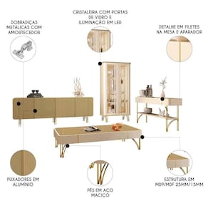 Inspirado nas formas orgânicas e no estilo industrial, o conjunto é composto por Buffet, Cristaleira, aparador e mesa de centro. Os móveis são fabricados em MDP e MDF de 15mm e contam com pés em aço maciço dourado.