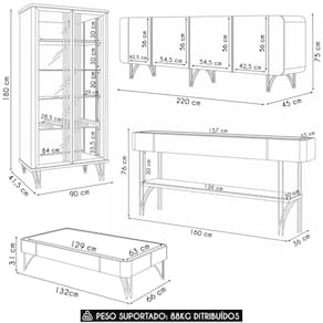 Peso Suportado Distribuído: Cristaleira 25Kg/ Buffet 43Kg/ Mesa 5Kg/ Aparador 15Kg.