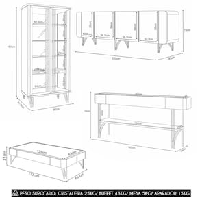 Peso Suportado Distribuído: Cristaleira 25Kg/ Buffet 43Kg/ Mesa 5Kg/ Aparador 15Kg.