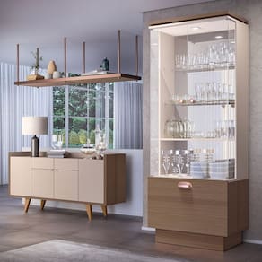 O conjunto de Cristaleira e Buffet combina elegância e praticidade. A Cristaleira possui duas portas de vidro e puxador em poliestireno, uma prateleira de MDP e duas prateleiras de vidro, iluminação LED e fundo espelhado, ampliando e destacando suas taças e louças, além de uma gaveta já com adega para acomodar suas bebidas. Já o Buffet Aparador oferece duas portas com puxadores em alumínio, duas gavetas com corrediças telescópicas. O tampo com bordas laterais, permite que suas decorações e garrafas fiquem mais seguras. Os pés em madeira maciça garantem resistência e estabilidade.