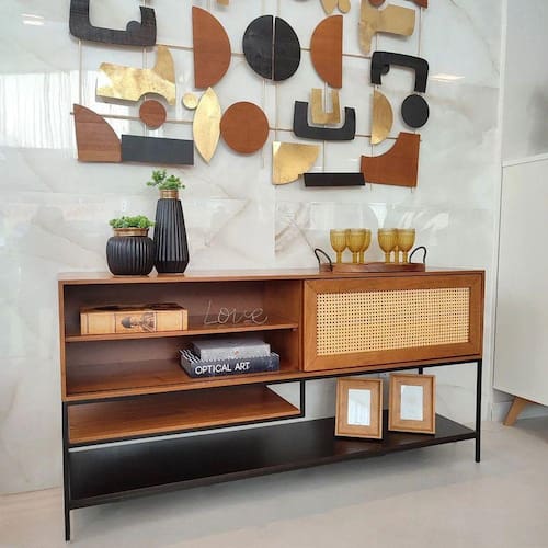 O Buffet Agnes é um mobiliário versátil, conferindo multifunções, além de ser lindo e sustentável! Possui estrutura metalica em aço com pintura eletrostática e a estrutura da bandeja com lâmina de sumaúma. O buffet Agnes possui um desing diferenciado com um toque rústico de um jeito que você nunca viu nada igual! Tenho certeza que vai deixar sua sala muito mais bonita! Confira e aproveite!