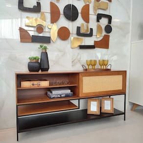 Buffet Aparador para Sala de Jantar - Agnes - Móveis Montanhês   O Buffet Agnes é um mobiliário versátil, conferindo multifunções, além de ser lindo e sustentável! Possui estrutura metalica em aço com pintura eletrostática e a estrutura da bandeja com lâmina de sumaúma. O buffet Agnes possui um desing diferenciado com um toque rústico de um jeito que você nunca viu nada igual! Tenho certeza que vai deixar sua sala muito mais bonita! Confira e aproveite!   Faz parte do anúncio: 1 Buffet Aparador para Sala de Jantar - Agnes - Montanhês Móveis Obs: Objetos decorativos não acompanham o produto.   Particularidades do Buffet: Características - Estrutura metalica em aço com pintura eletrostática - Feito com lâmina de sumaúma - Detalhe de telinha (rattan) - Design rústico e sofisticado - Madeira Ecologicamente Correta - Baseado em conceitos sustentáveis - Madeira altamente resistente   Dimensões Buffet Altura: 80 centímetros Largura: 1,60 metros Profundidade: 40 centímetros     Informações Importantes: - Produtos podem apresentar diferenças de tonalidades entre a foto na tela e o produto real, devido a calibração de cor de tela.   - Limpar com flanela ou pano macio. Não utilizar álcool. Não utilizar produtos abrasivos ou corrosivos. - Nós prezamos pela qualidade da entrega em primeiro lugar, trabalhamos com transportadoras altamente selecionadas e os melhores materiais de embalagem. - Todos os itens já vão semi montados e embalados. - Não necessita de montagem de um profissional, ficando a critério do cliente. - NÃO NOS RESPONSABILIZAMOS PELA MONTAGEM. - Objetos de decoração não incluso. - Certifique-se de que o produto caiba em elevadores e vãos de escadas, não fazemos içamentos ou desmontagens de produtos. Quaisquer despesas deste tipo ficam a cargo do cliente. - Garantia de 3 meses contra defeitos de fabricação.