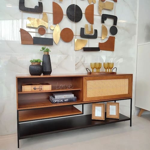 Buffet Aparador para Sala de Jantar - Agnes - Móveis Montanhês O Buffet Agnes é um mobiliário versátil, conferindo multifunções, além de ser lindo e sustentável! Possui estrutura metalica em aço com pintura eletrostática e a estrutura da bandeja com lâmina de sumaúma. O buffet Agnes possui um desing diferenciado com um toque rústico de um jeito que você nunca viu nada igual! Tenho certeza que vai deixar sua sala muito mais bonita! Confira e aproveite! Faz parte do anúncio: 1 Buffet Aparador para Sala de Jantar - Agnes - Montanhês Móveis Obs: Objetos decorativos não acompanham o produto. Particularidades do Buffet: Características - Estrutura metalica em aço com pintura eletrostática - Feito com lâmina de sumaúma - Detalhe de telinha (rattan) - Design rústico e sofisticado - Madeira Ecologicamente Correta - Baseado em conceitos sustentáveis - Madeira altamente resistente Dimensões Buffet Altura: 80 centímetros Largura: 1,60 metros Profundidade: 40 centímetros Informações Importantes: - Produtos podem apresentar diferenças de tonalidades entre a foto na tela e o produto real, devido a calibração de cor de tela. - Limpar com flanela ou pano macio. Não utilizar álcool. Não utilizar produtos abrasivos ou corrosivos. - Nós prezamos pela qualidade da entrega em primeiro lugar, trabalhamos com transportadoras altamente selecionadas e os melhores materiais de embalagem. - Todos os itens já vão semi montados e embalados. - Não necessita de montagem de um profissional, ficando a critério do cliente. - NÃO NOS RESPONSABILIZAMOS PELA MONTAGEM. - Objetos de decoração não incluso. - Certifique-se de que o produto caiba em elevadores e vãos de escadas, não fazemos içamentos ou desmontagens de produtos. Quaisquer despesas deste tipo ficam a cargo do cliente. - Garantia de 3 meses contra defeitos de fabricação. Marca: Não Informado
