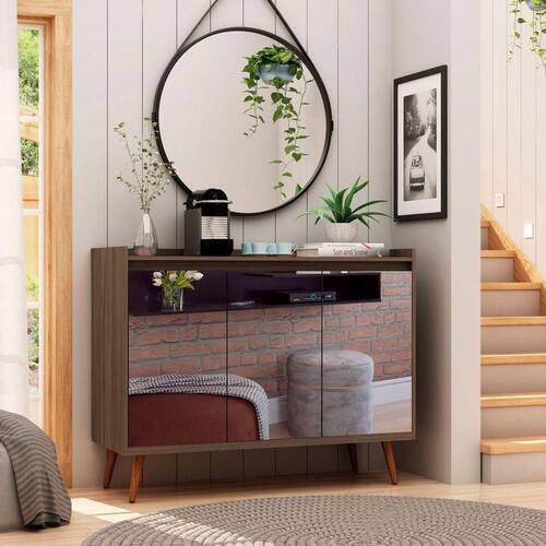 Buffet Aparador Retrô Com Espelho Clássico 3 Portas Malbec - Moveisaqui Ideal para organizar melhor sua sala de jantar ou de estar, o Buffet Aparador Retrô com Espelho Clássico 3 Portas - MoveisAqui trouxe de volta a pegada retrô que veio para ficar. Os pés estilo palito, levemente angulados, se destacam pelo charme que garante à peça. Seus compartimentos internos são ideais para armazenar e organizar diversos tipos de objetos pessoais, além de seu aparelho de jantar e demais itens que sejam necessários. Lindo, robusto e versátil, garante um espaço moderno e ões do Produto Montado:Altura: 96 cmLargura: 120 cmProfundidade: 45 cmObservações:- Produzido em MDP;- 3 portas com dobradiças metálicas;- Pés palito, estilo retrô, em madeira pinus;- Peso suportado por prateleira: até 7kg;- Portas com espelho incluso;- Pintura Ultravioleta com acabamento semi brilho. Marca: Não Informado